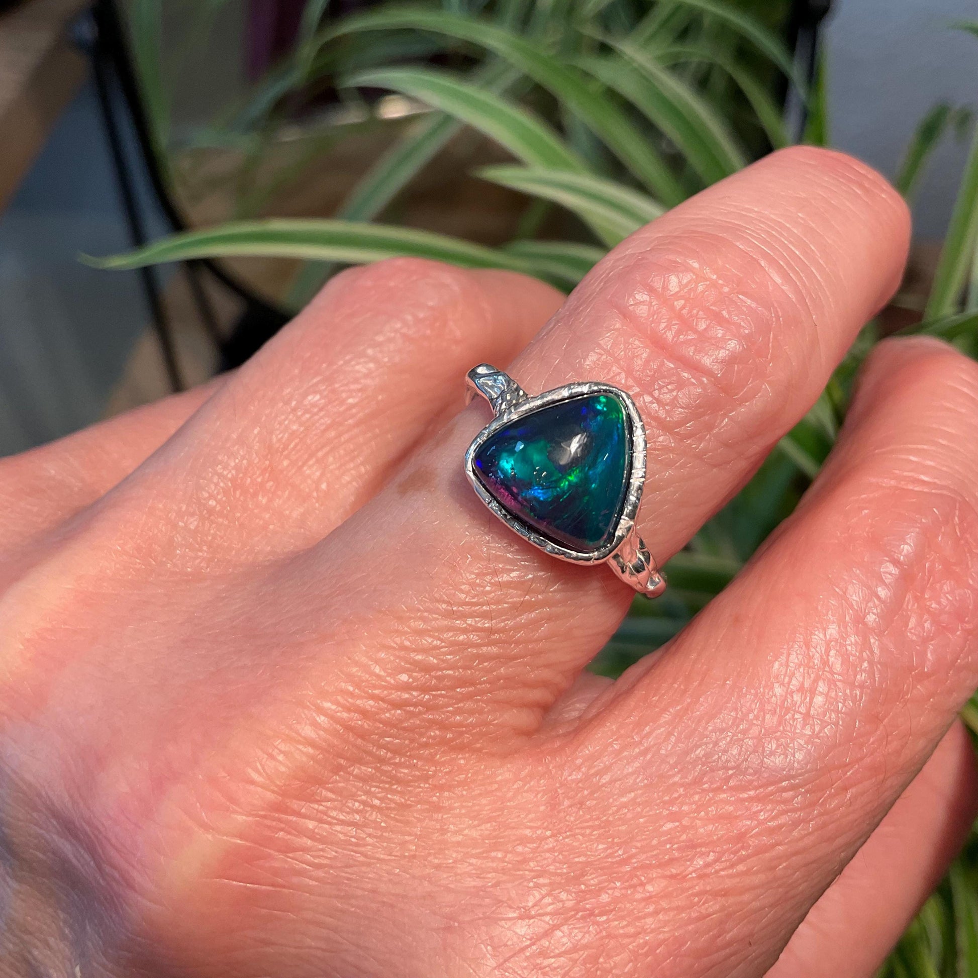 Natural black blue fire opal Sterling Silver Ring 7.5