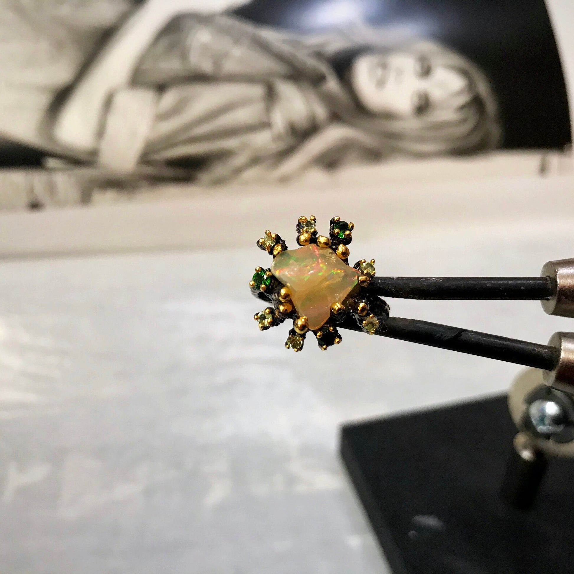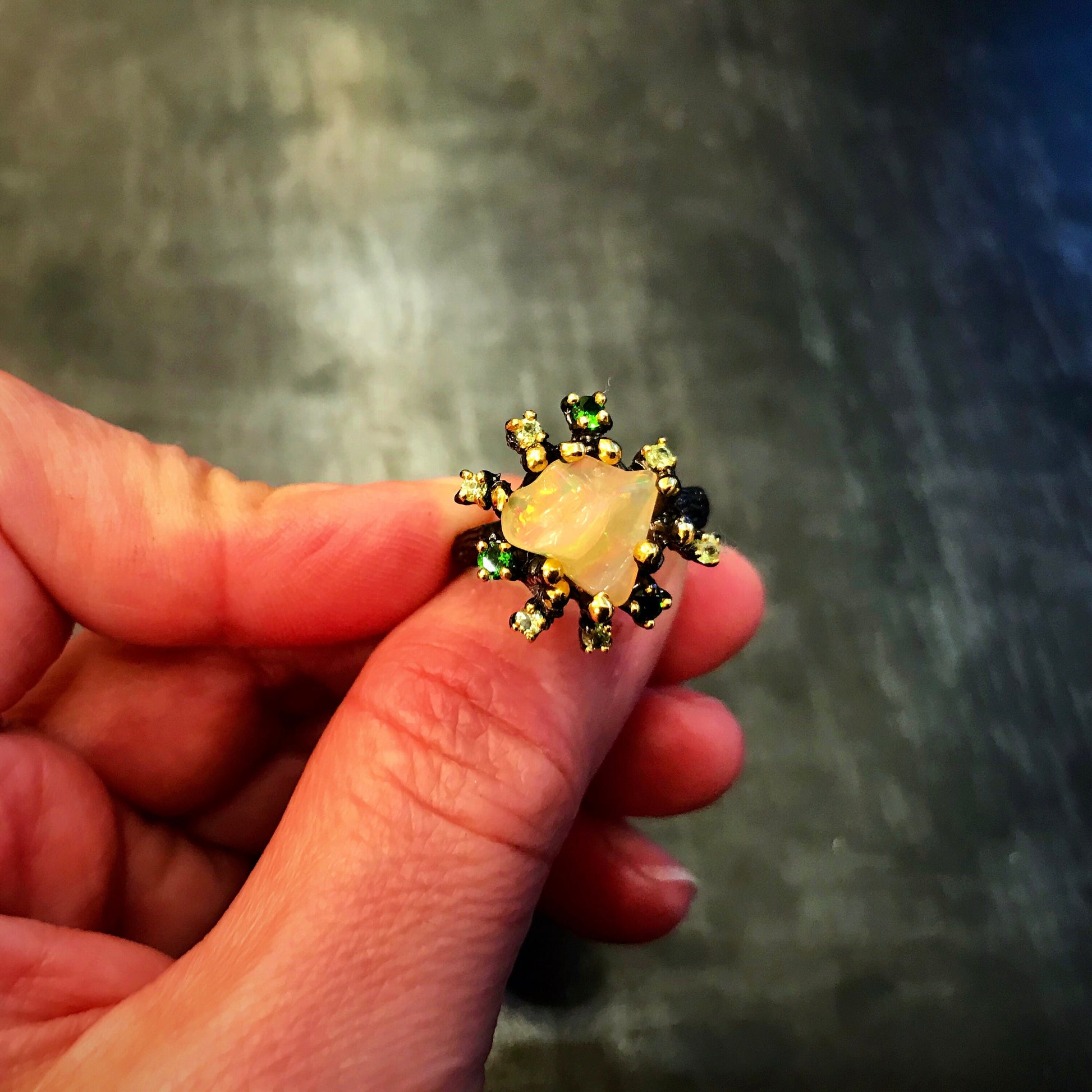 Rough Rainbow Opal Sterling Silver Ring: Peridot & Chrome Diopside, Size 7