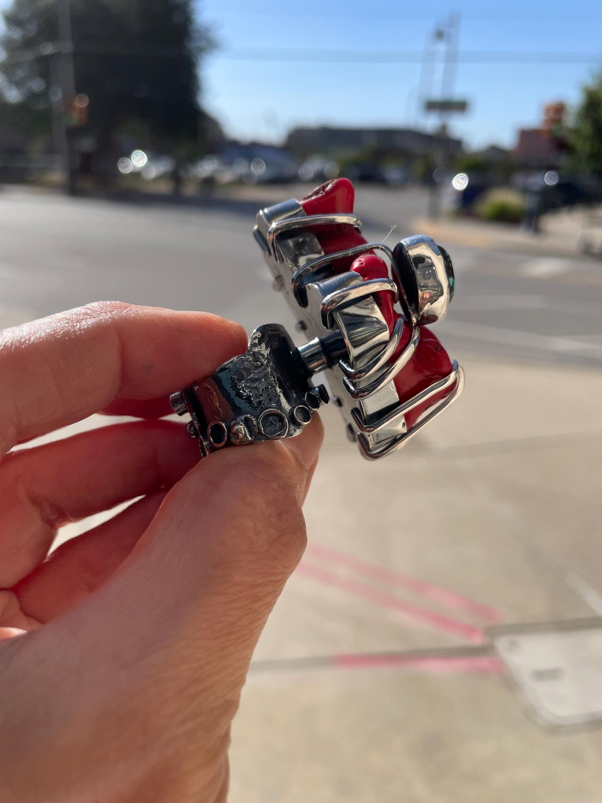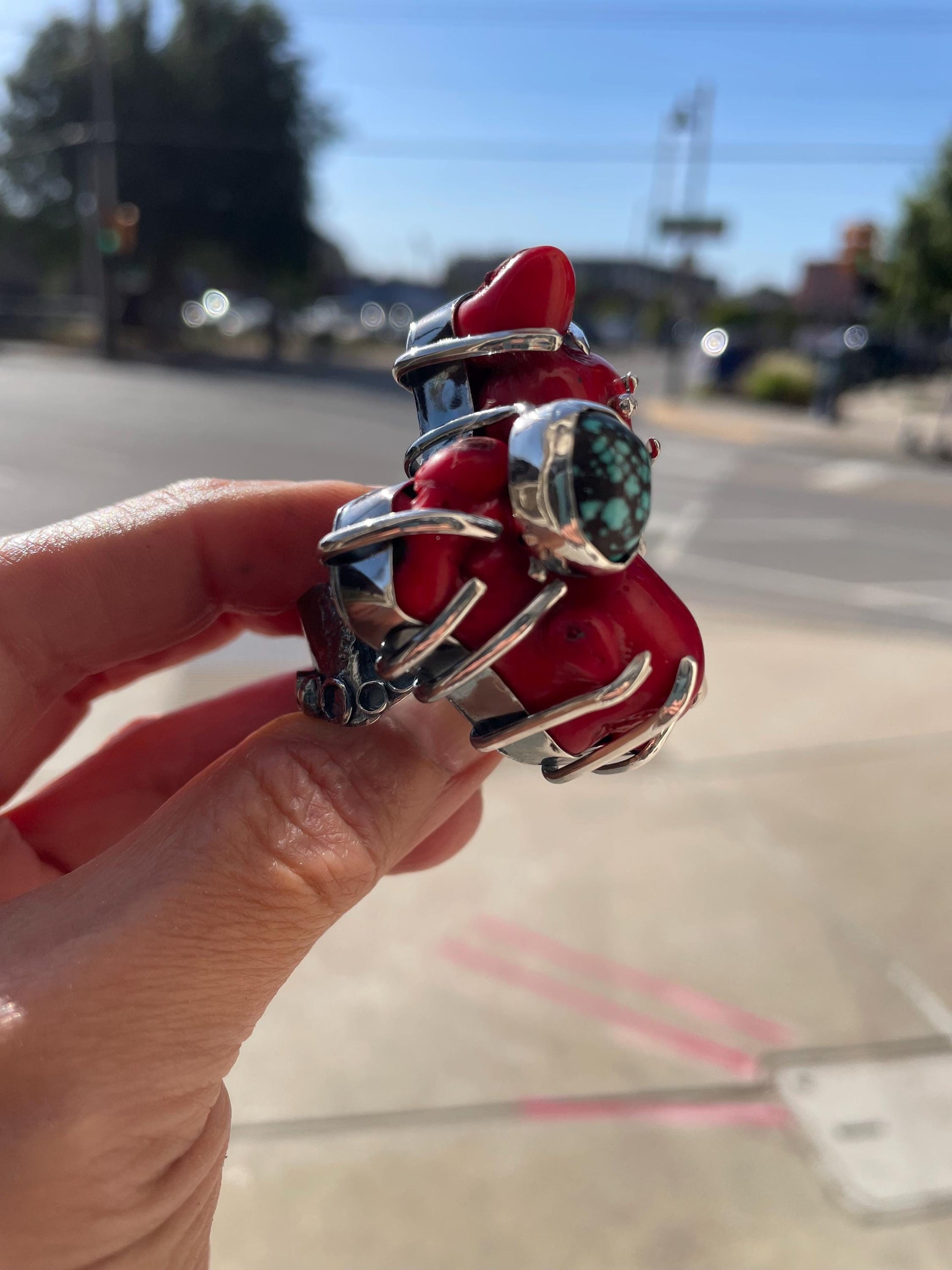 Sterling massive red coral branch turquoise brutalist huge cuff ring