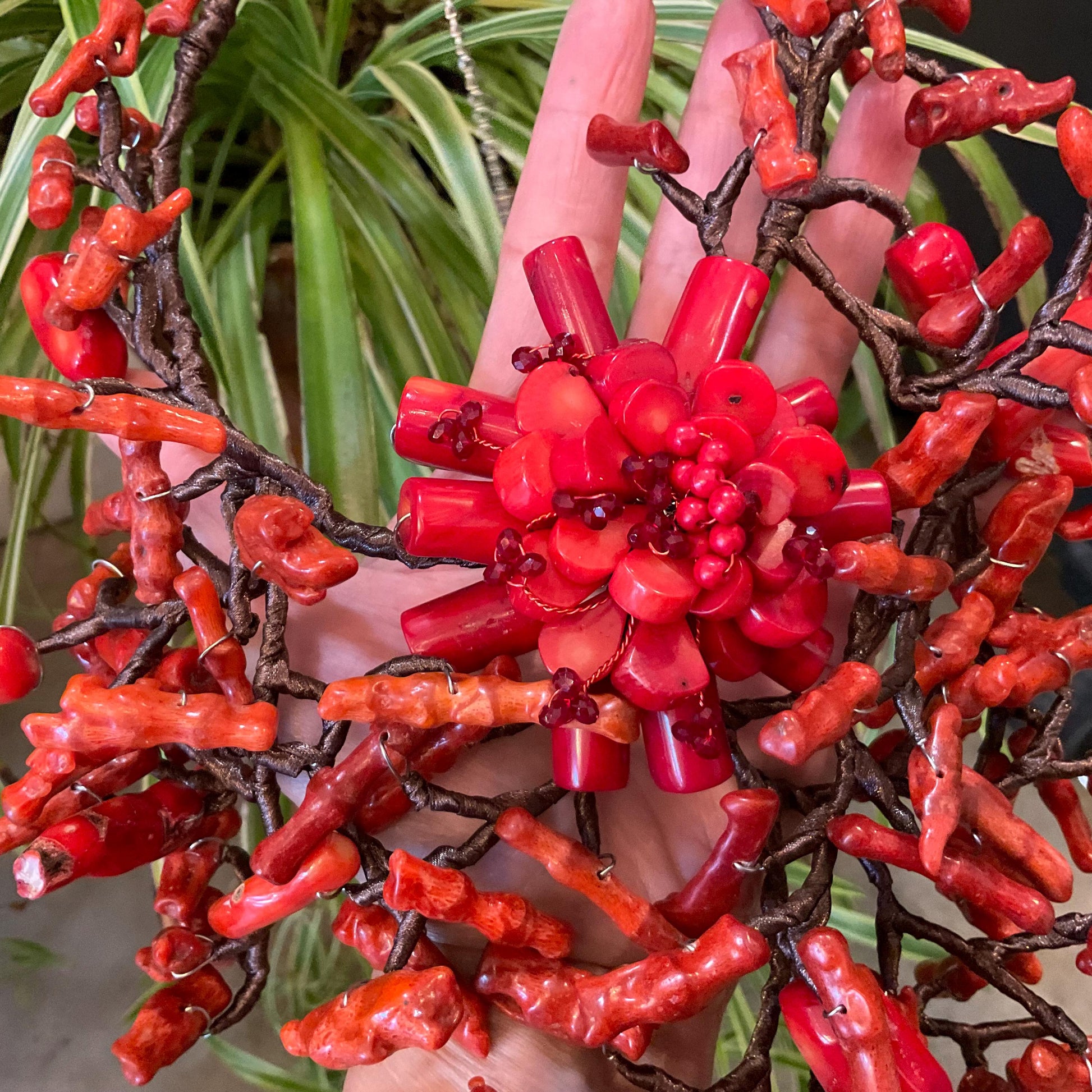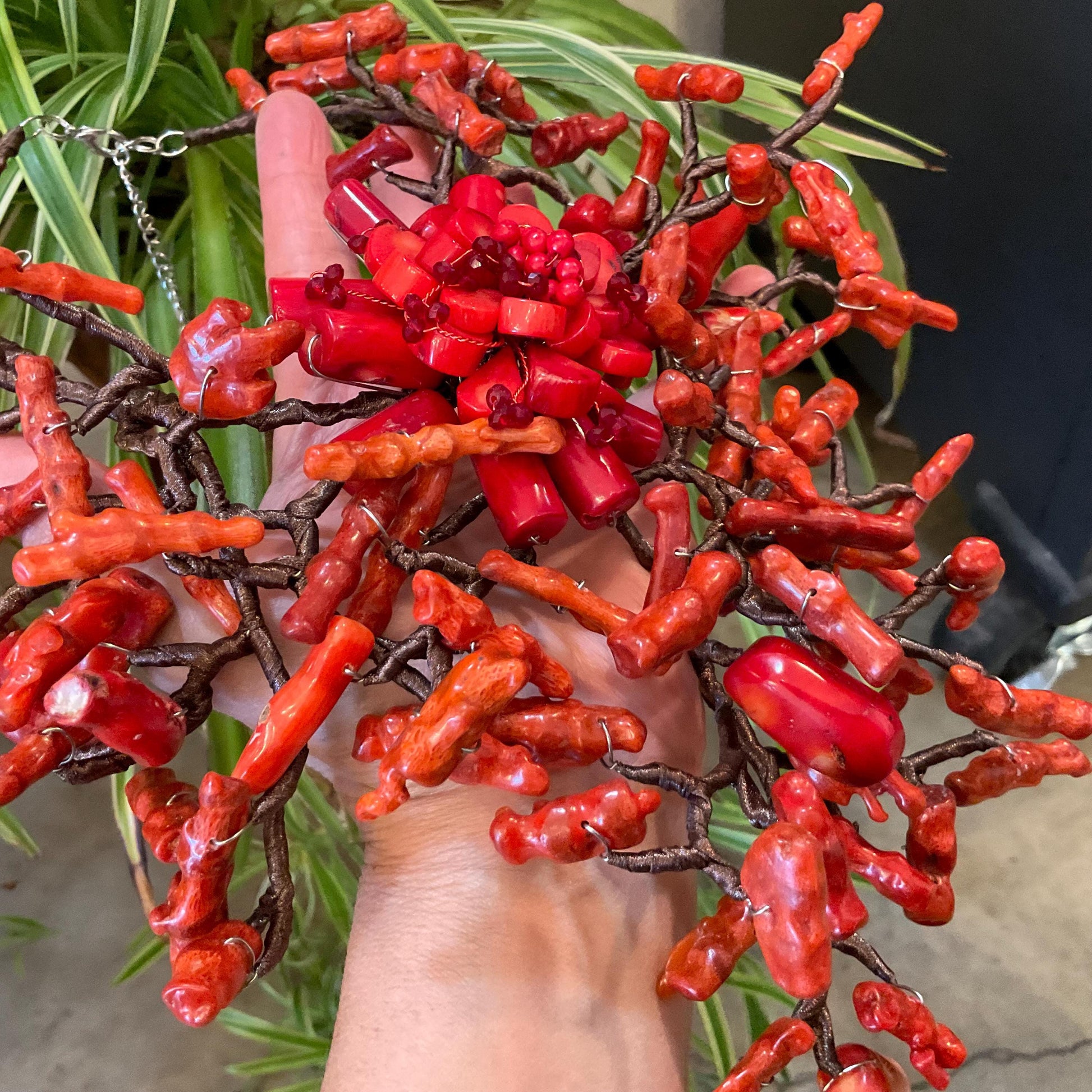 Sterling Silver Natural art red coral mix runway Statement Necklace