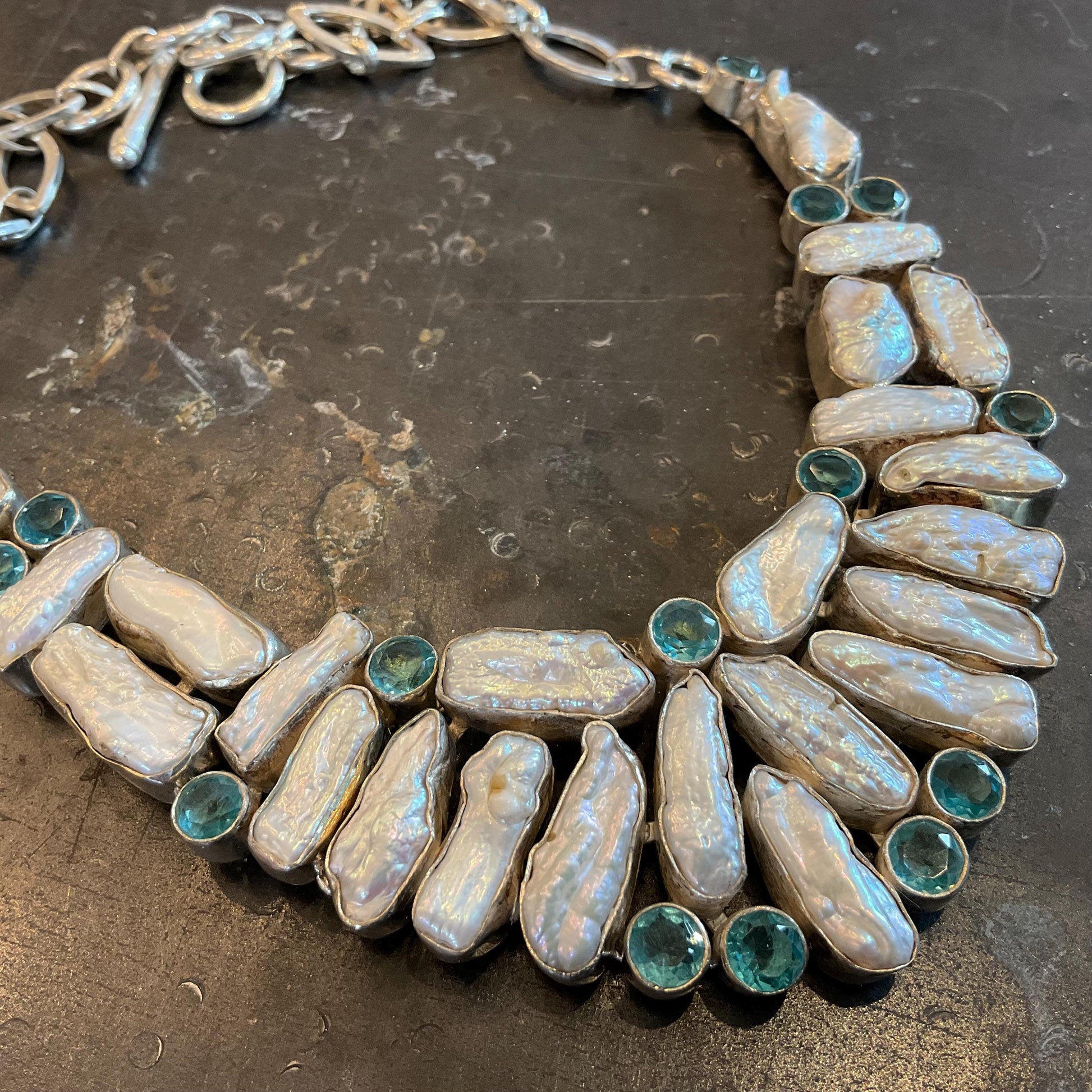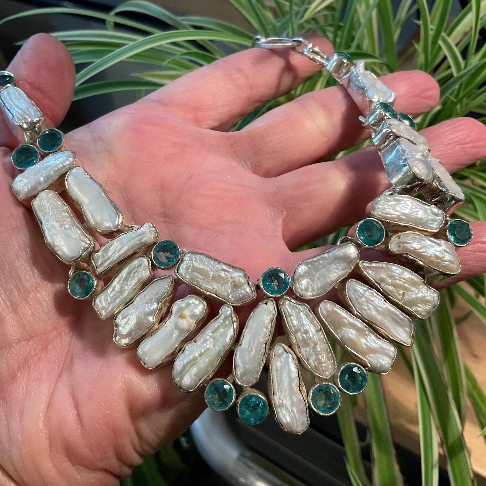 sterling silver Natural biwa Pearl vintage Statement necklace