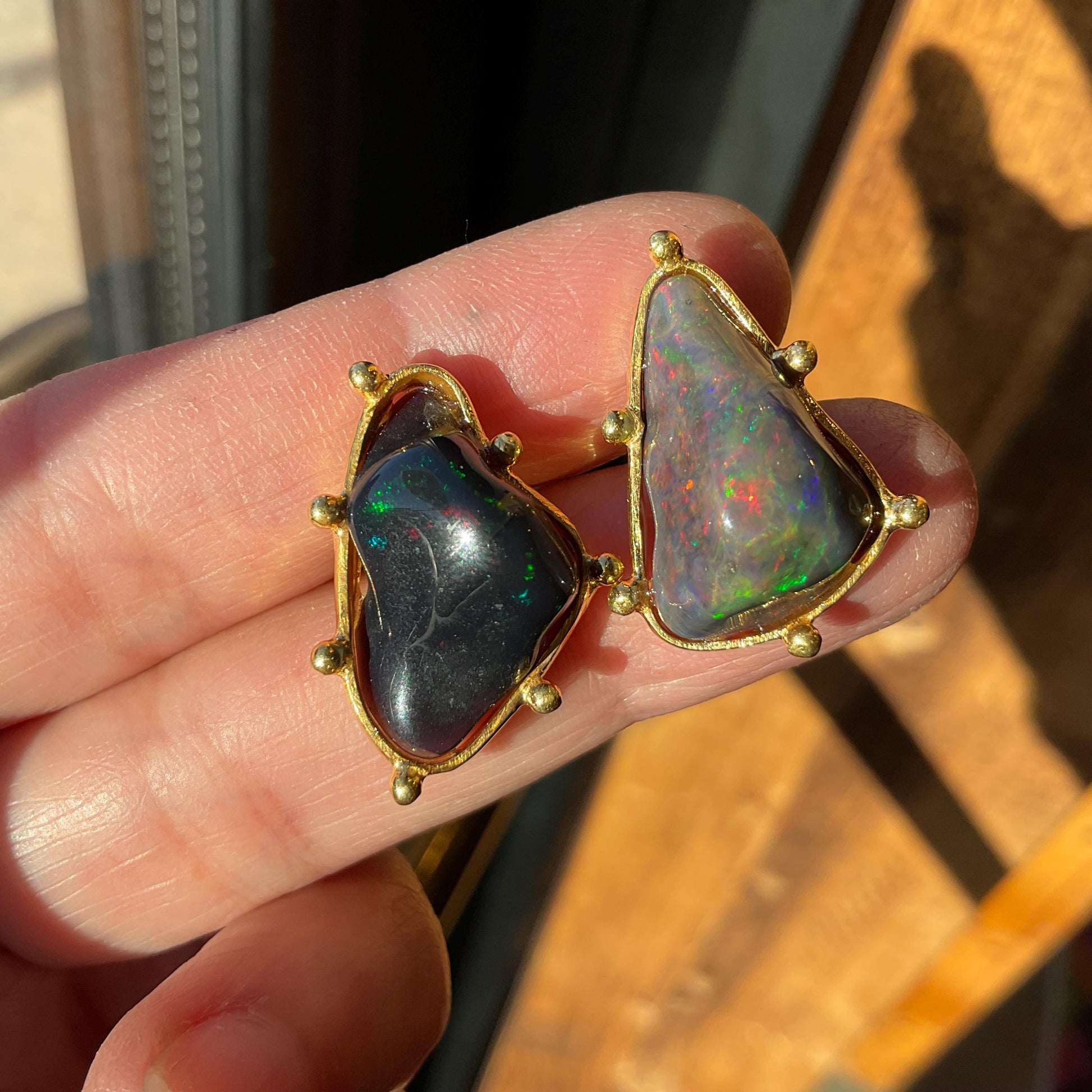 Sterling Silver Natural black fire Opal heirloom asymmetrical stud Earrings