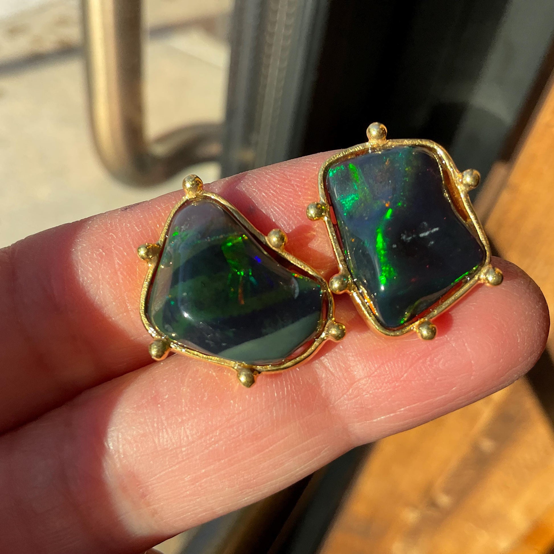 Sterling Silver Natural black fire Opal heirloom large asymmetrical stud Earrings