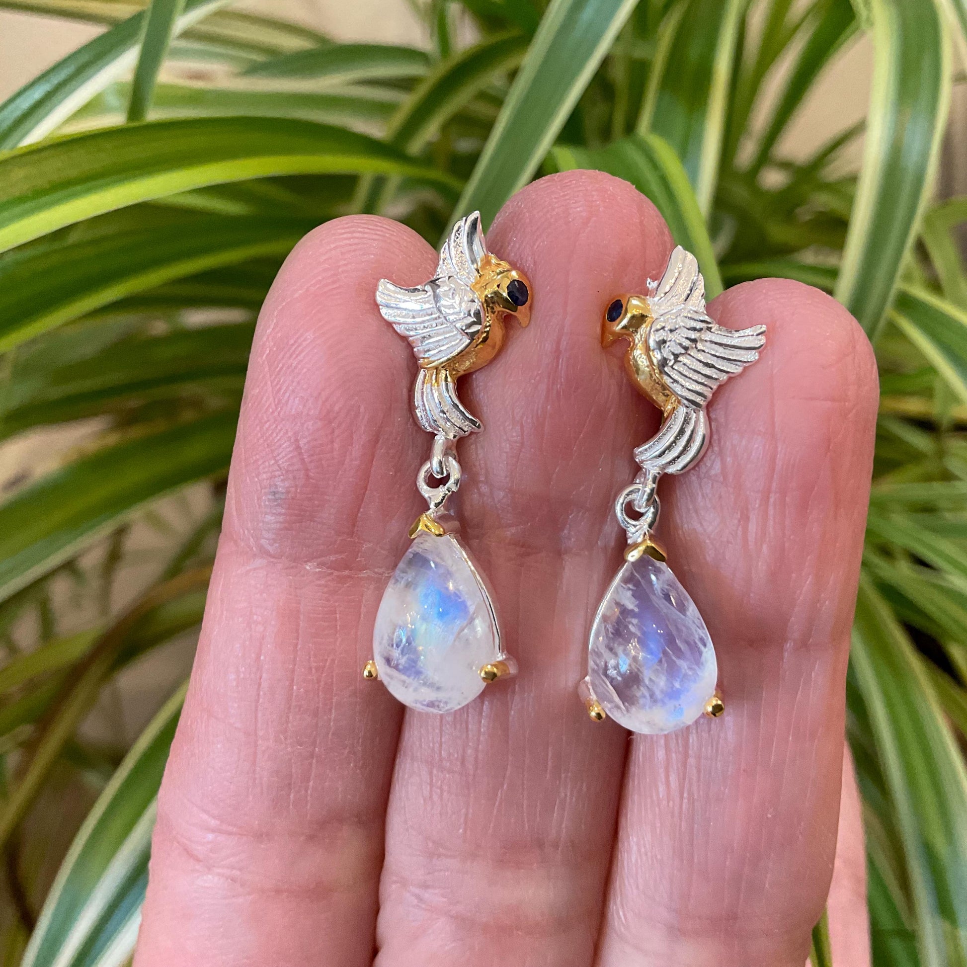 Sterling Silver natural moonstone dangle bird sapphire earrings