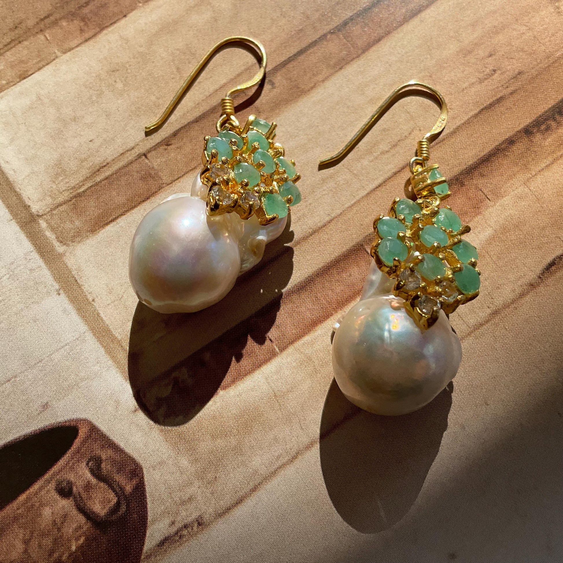 natural emeralds white baroque pearls.