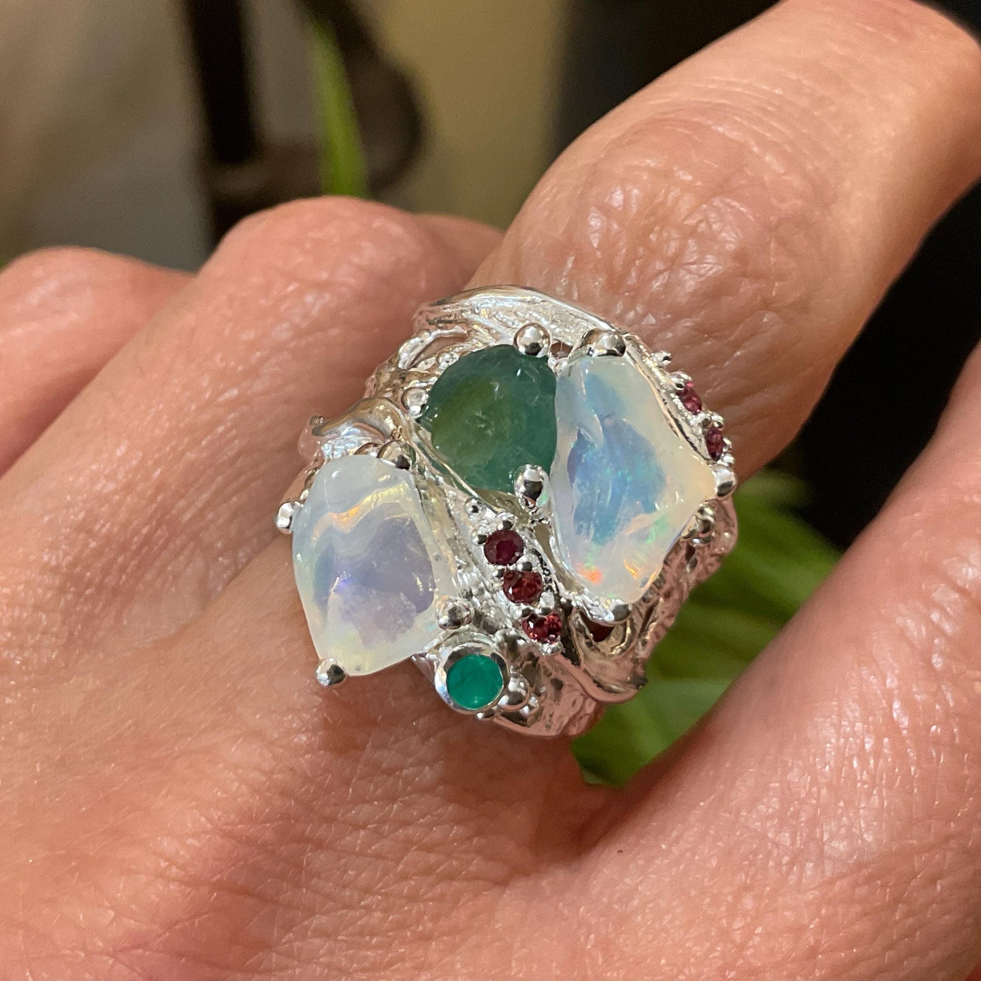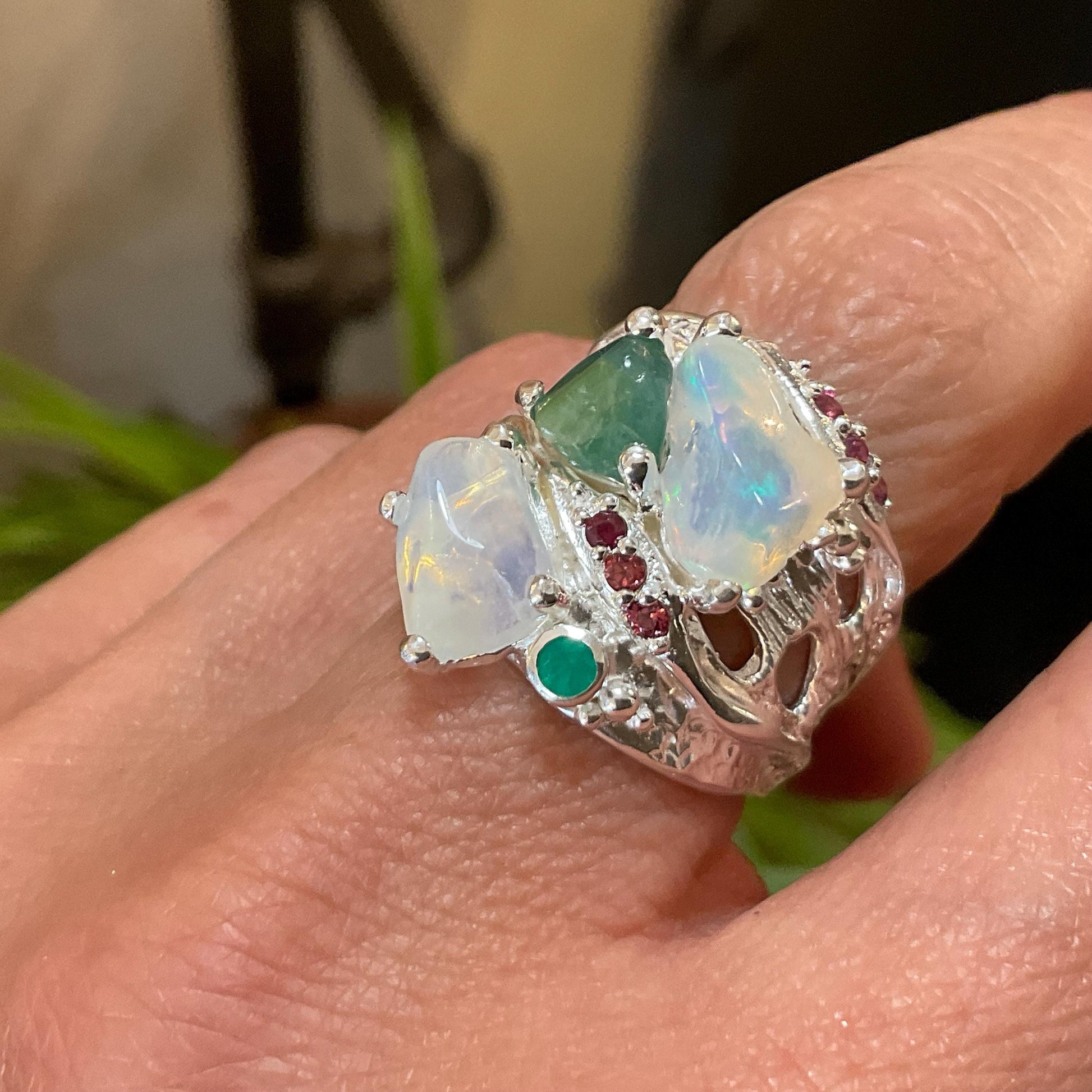 sterling silver rainbow natural rough rainbow rhodolite tourmaline opal band ring 8