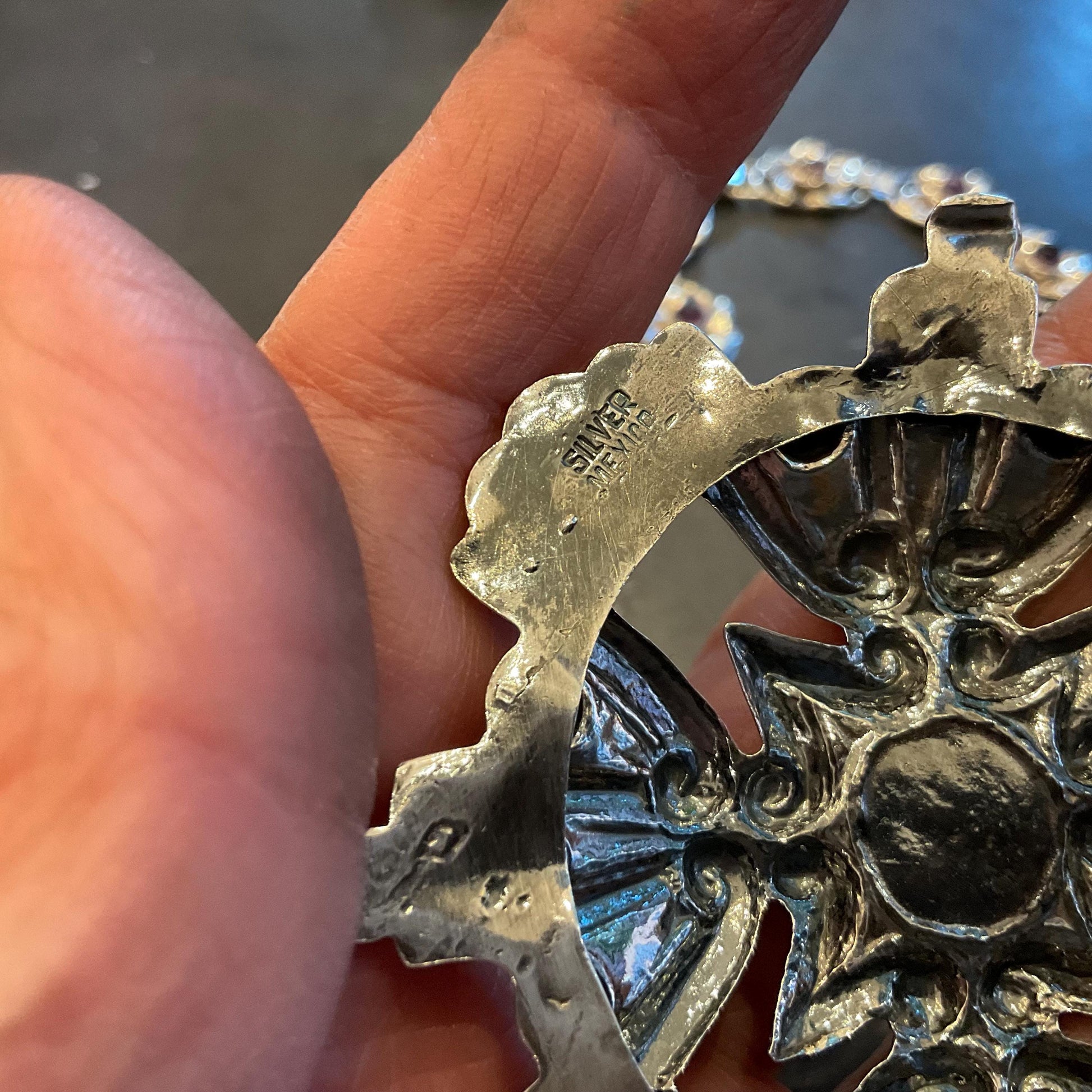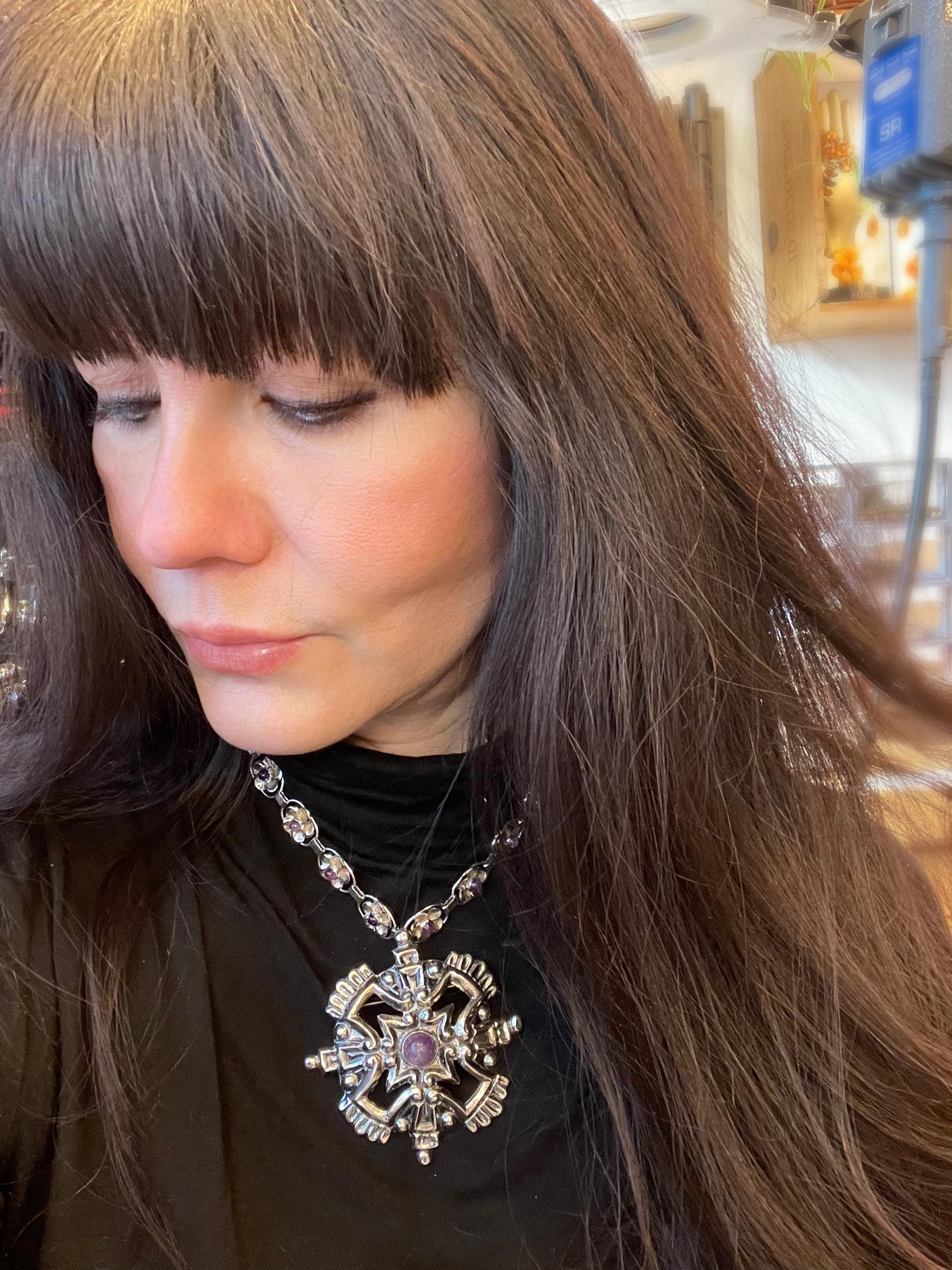 Necklace is a Taxco eagle 22 Beto piece short necklace and the pendant enhancer is a Brooch cross with amethyst, just marked Silver Mexico