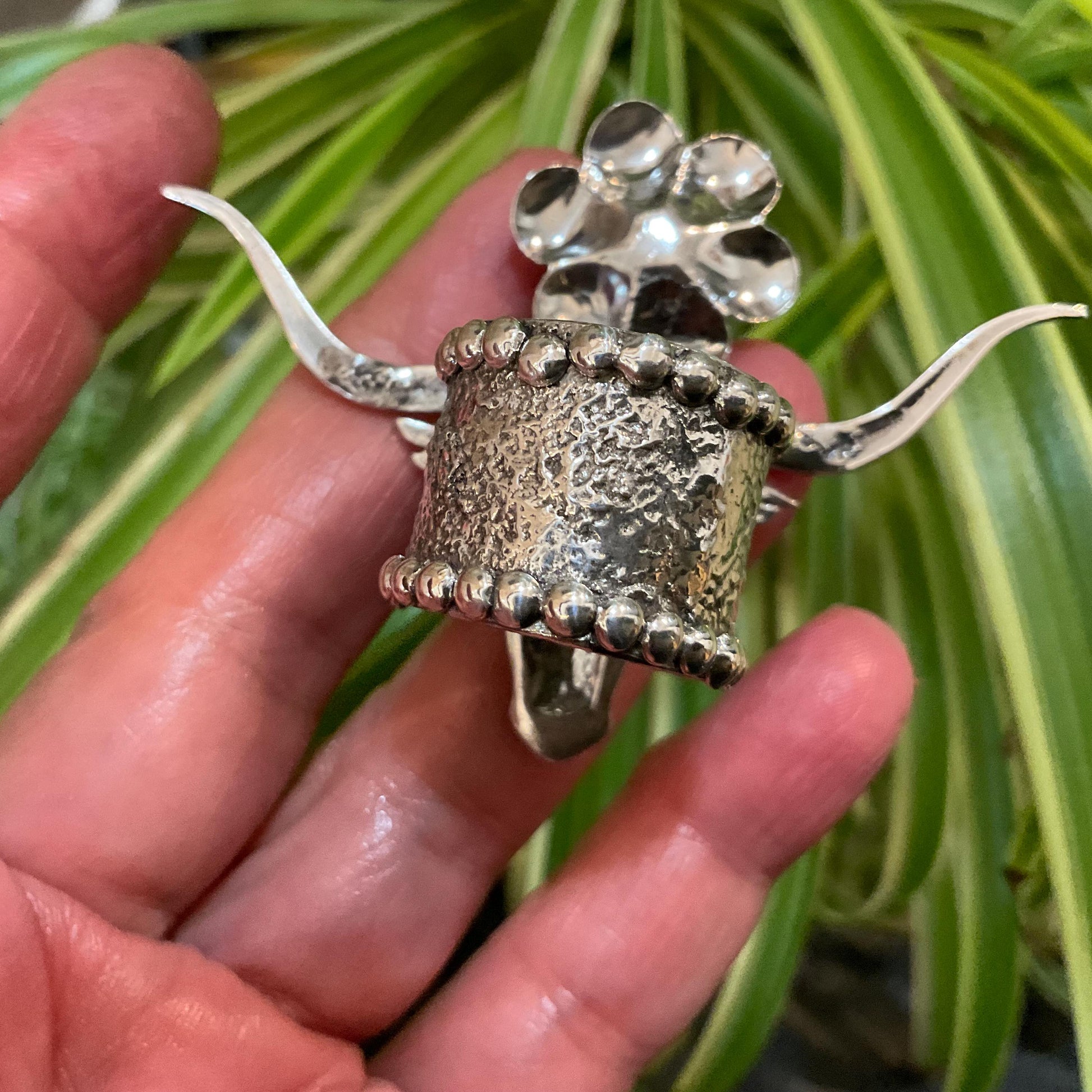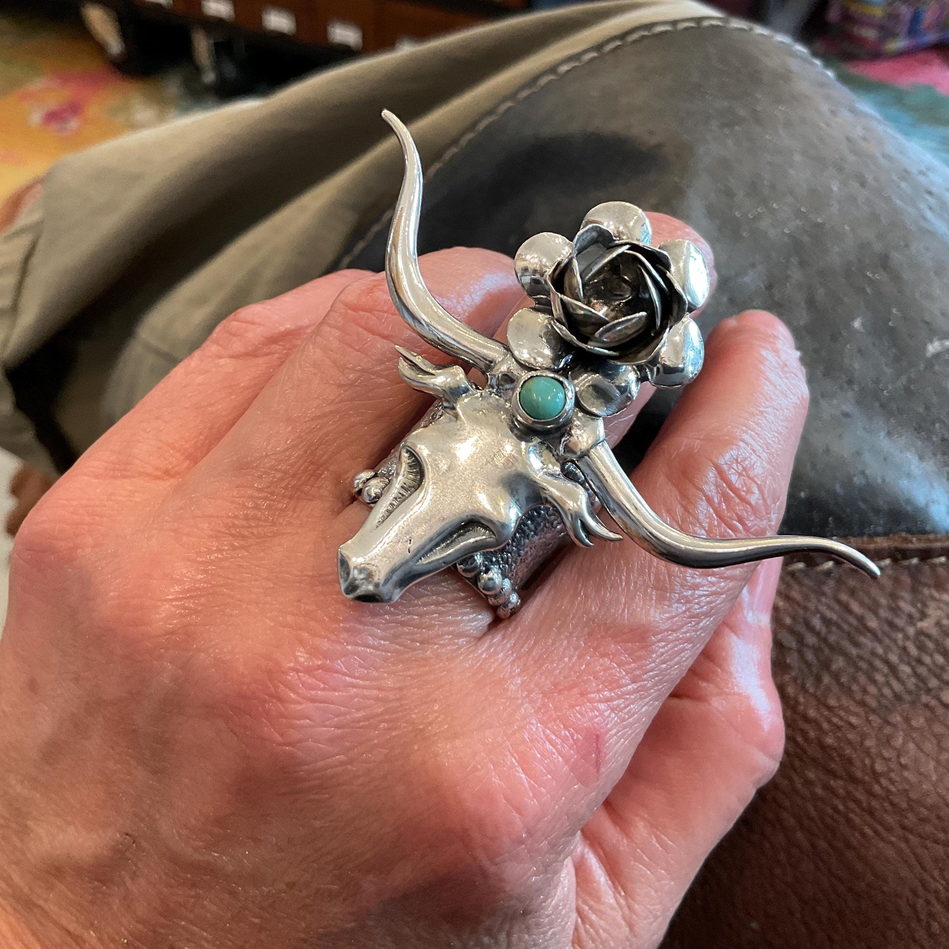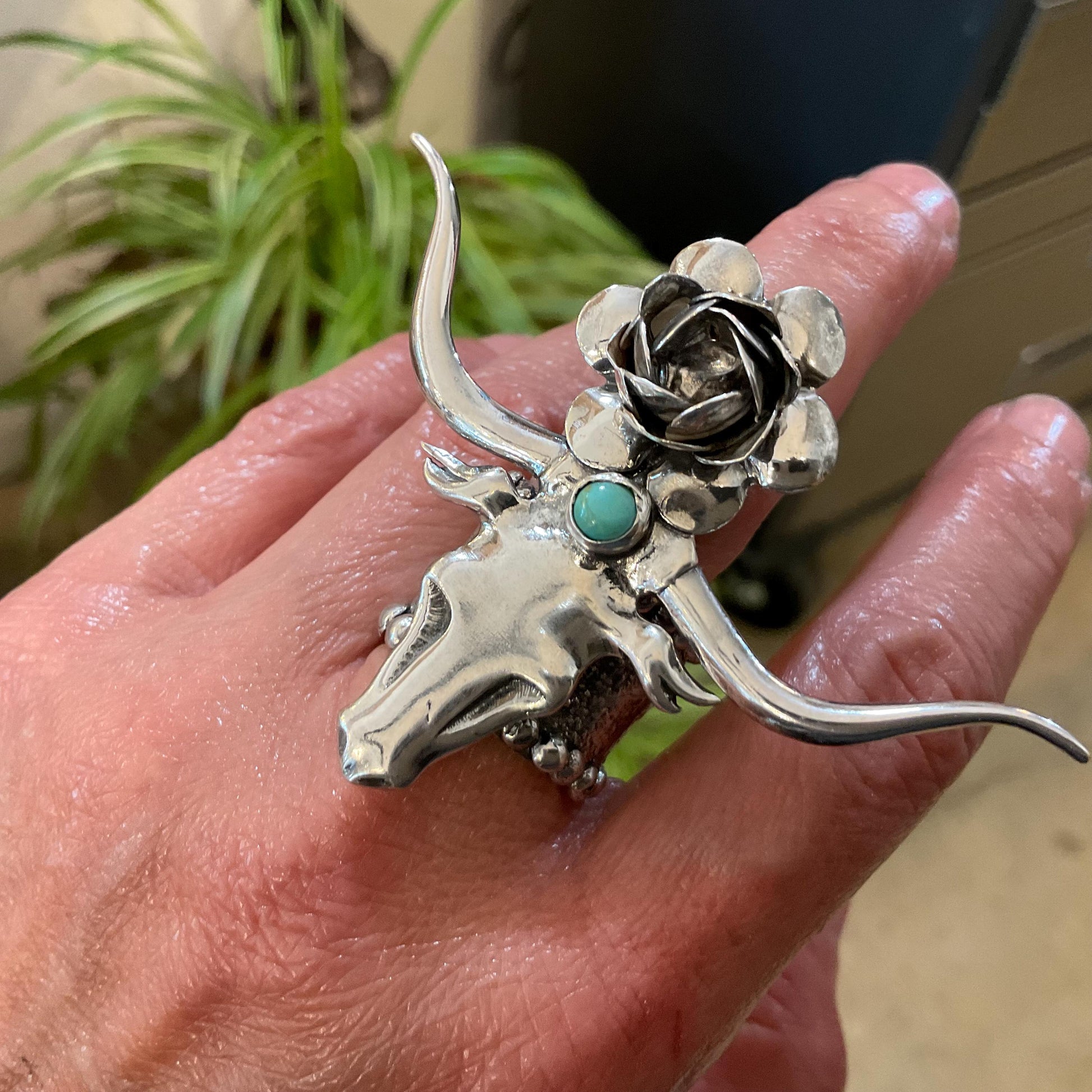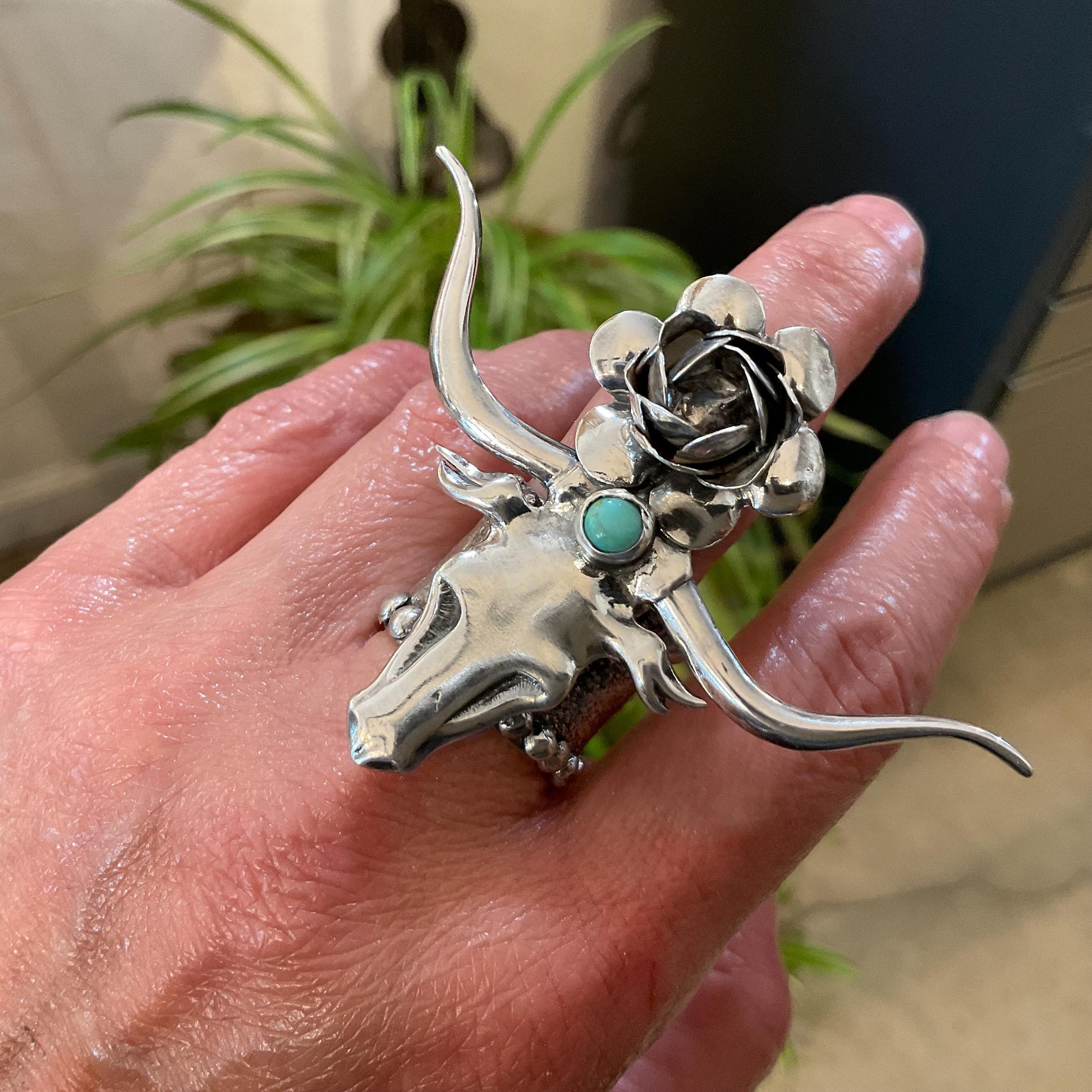 Turquoise Sterling Statement long horn wester turquoise adjustable cuff ring